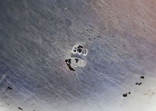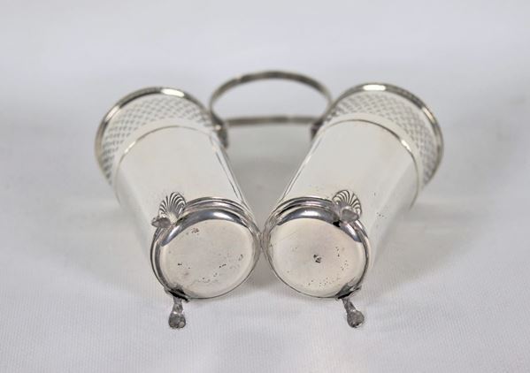 Double breadstick holder in chiseled and perforated silver with handle and four lion feet gr. 250