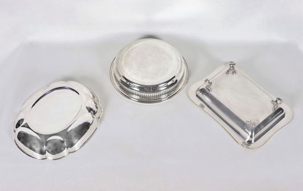 Embossed and chiseled silver metal lot of a fruit holder, an oval fruit bowl and a round fruit bowl