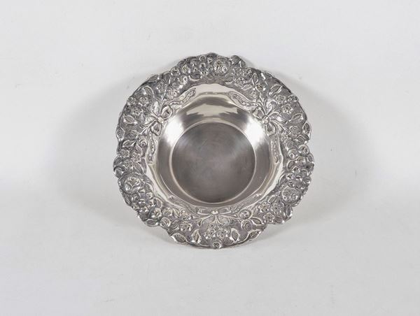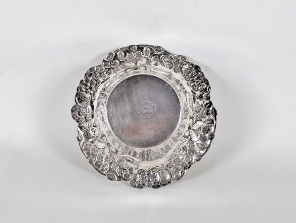 English sheffield bottle coaster with embossed and chiseled edge with flower motifs