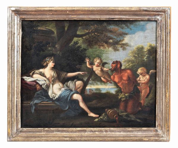 Follower of. "Venus and the Faun with cupids" small oil painting on canvas of excellent pictorial execution