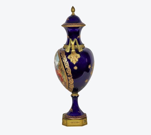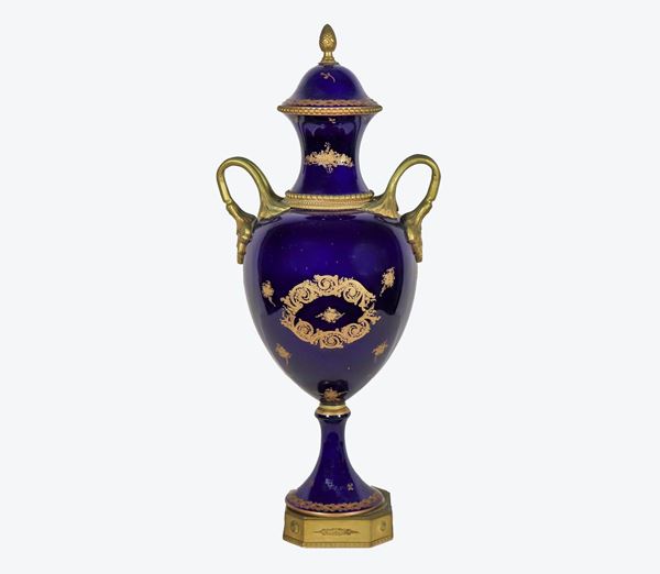 French amphora vase in cobalt blue Sèvres porcelain, highlights in pure gold and bronzes