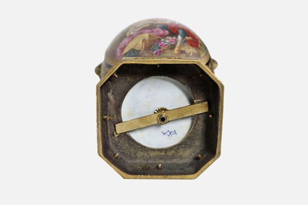 in the center medallion with painted gallant scene, curved flower-shaped handles, supported by an octagonal base, cm 31 x 73 h.