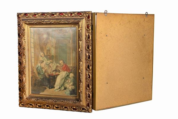 French colored print "Morning breakfast" in gilded and carved frame