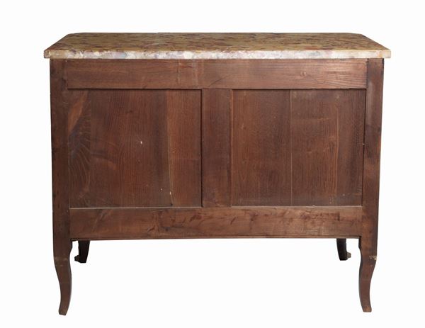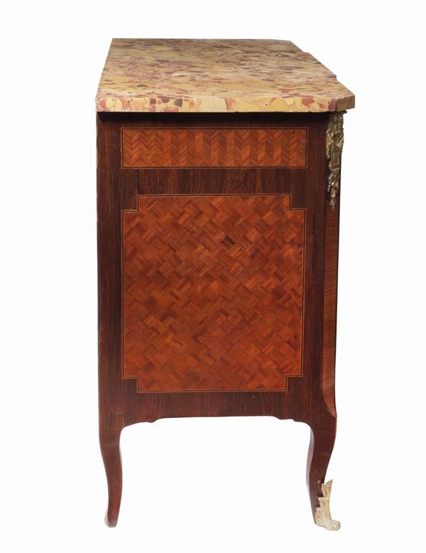 with marquetry inlays and a central basket of flowers, friezes and trimmings in gilded and chiseled bronze. Brecciated marble top, three drawers and curved legs, 109.5 x 51 x 89 h.