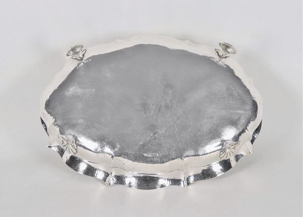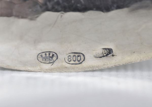 Fruit bowl in hammered silver in an oval shape, supported by four feet in the shape of shells gr. 680