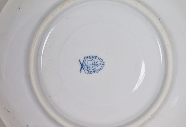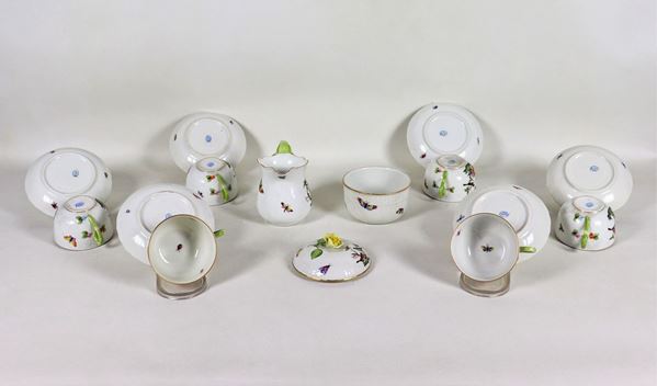 Herend porcelain milk jug, sugar bowl and six cups with saucers with colorful decorations with motifs of flowers, birds, insects and butterflies [..]