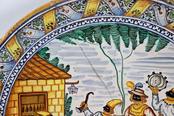Large plate called "a capone" in glazed majolica (Neapolitan factory of Ponte della Maddalena or Borgo Loreto) with "Banchetto di Pulcinelli" [..]
