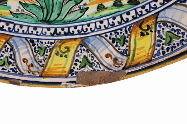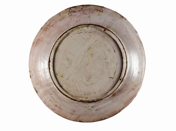 The plate has a defect in the center with a deep felatura. A similar specimen is kept at the Duca di Martina Museum at the Villa Floridiana in Naples, diameter 44 cm.