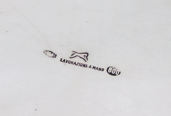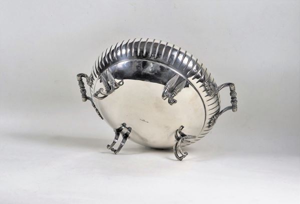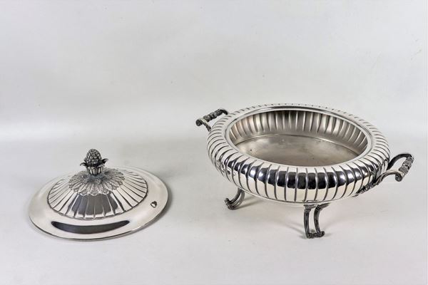 Large tureen in chiseled and embossed silver with two handles, pineapple-shaped pommel and four curved feet gr. 2050
