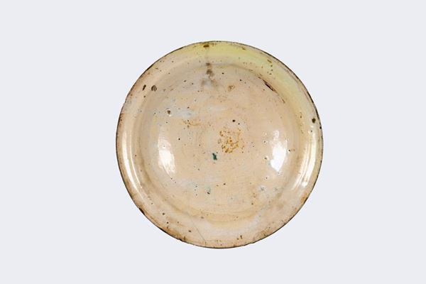 Laterza glazed majolica wall plate with colorful decorations and vase with flowers and tree in the center
