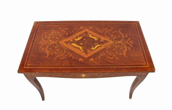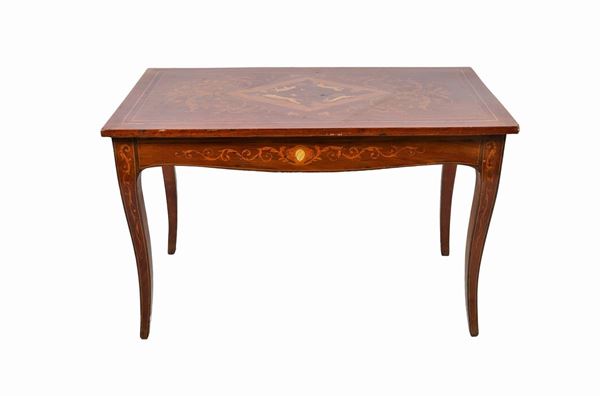 Lombard living room table in walnut and boxwood with geometric inlays, floral scrolls and animal figures