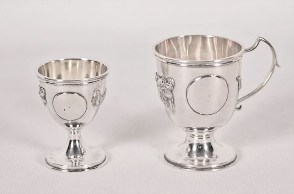 Lot in Chinese silver of a small glass with handle and an egg cup with embossed dragons figures gr. 115