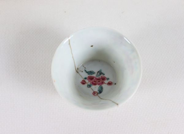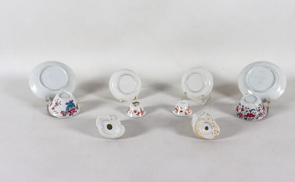 Lot in polychrome Chinese porcelain of four sake cups with saucers and two "Sages" shaped salt shakers (6 pcs)