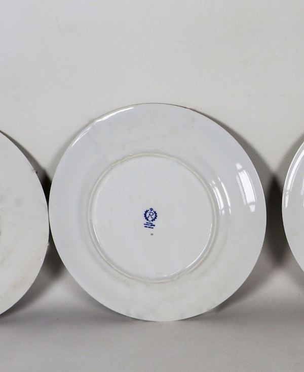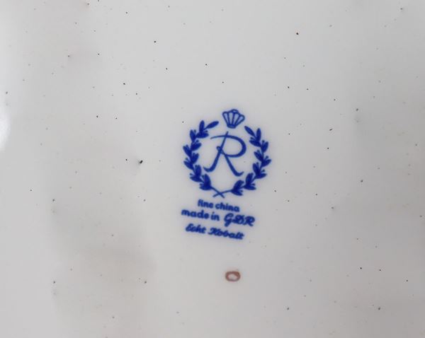 Lot of five wall plates in ex-East German German porcelain with blue decorations of ancient sailing ships and gilded wind roses
