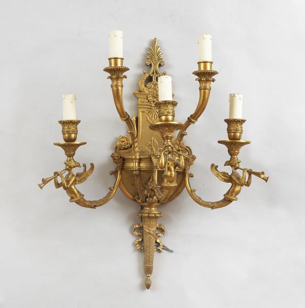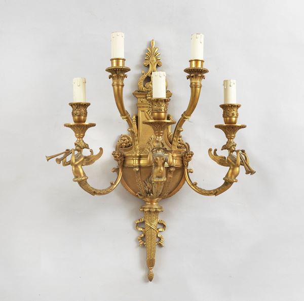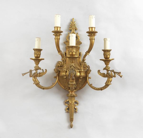 Lot of three French appliques in gilded and chiseled bronze with Empire motifs, 5 lights each