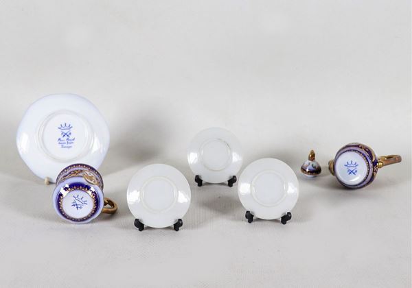 Lot of toys in polychrome porcelain: coffee pot, cup with saucer and three round saucers (5 pcs)