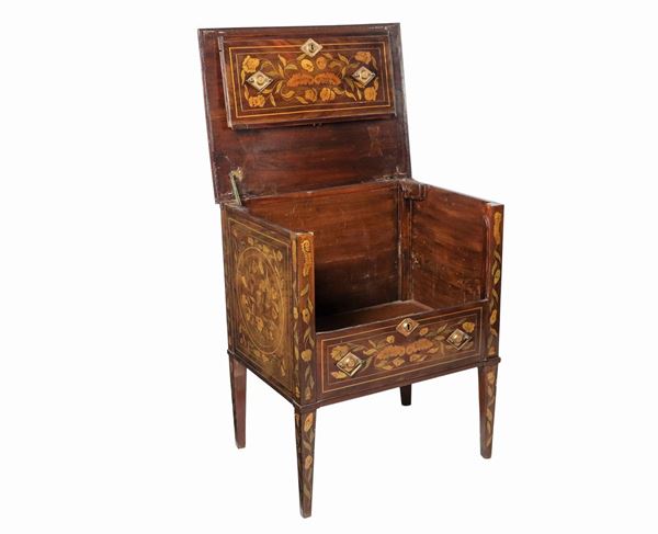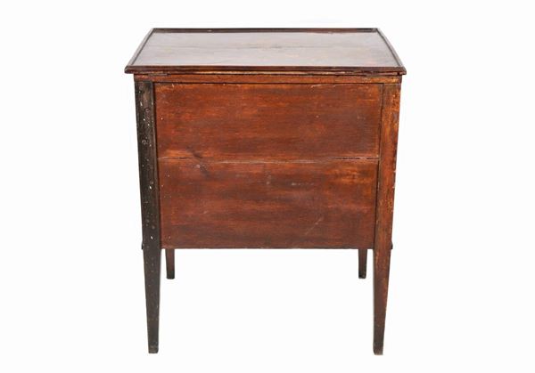 with two fake drawers, liftable top with large internal compartment and four inverted truncated pyramid legs, cm 57 x 43 x 68.5 h.