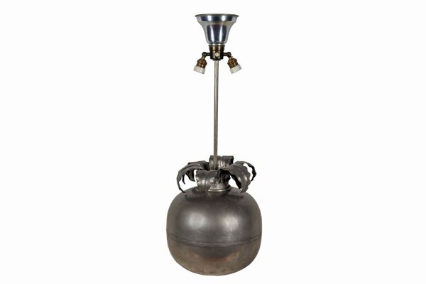 Original pewter table lamp in the shape of a pineapple with a particular shade in painted fabric