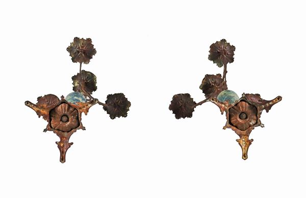Pair of antique candelabra in gilded bronze and marbled ceramic, 4 flames each
