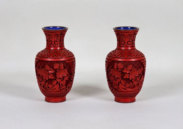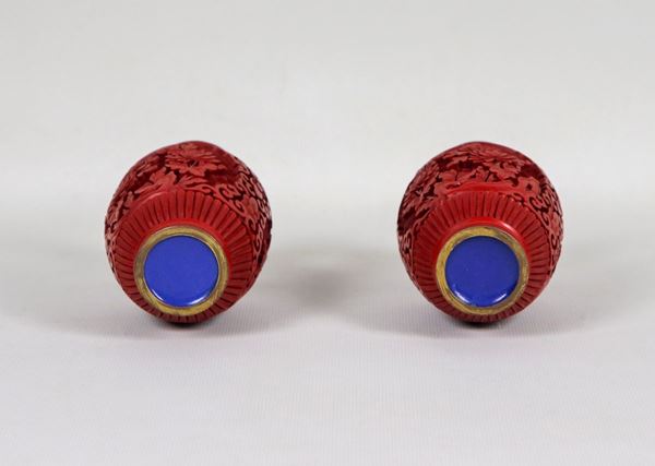 Pair of antique Chinese jars in cloisonné enamel and red lacquer worked in relief
