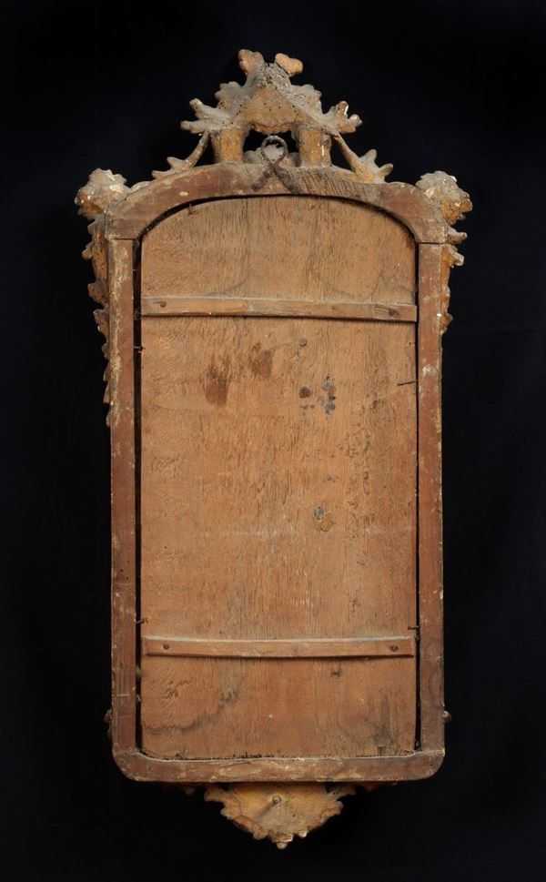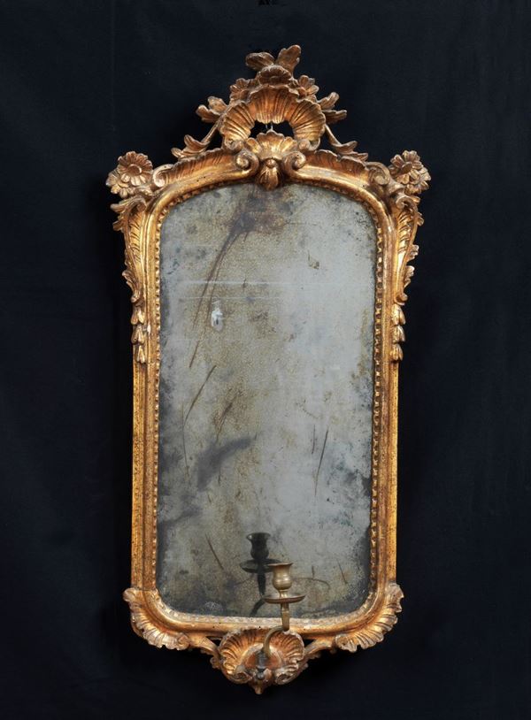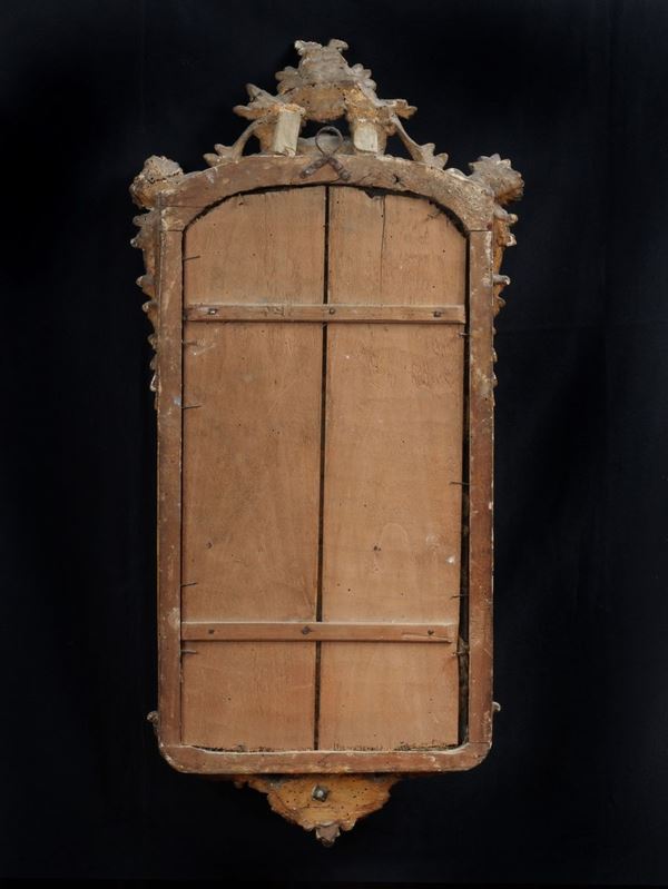carved with motifs of leaves, flowers and shells, in the center a candle holder. Mercury mirrors, 42 x 85 h each.