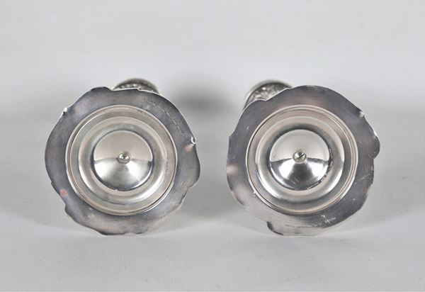 entirely chiseled and embossed with scrolls and floral garlands. Base diameter 11.5 cm x 28 h each.