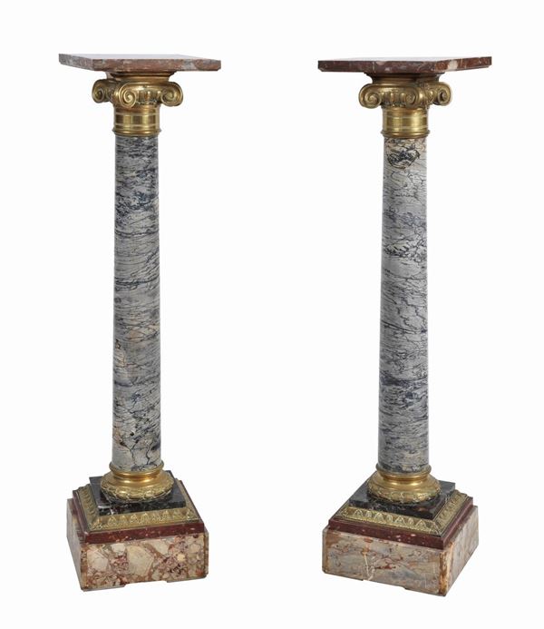Pair of columns in Caristo wrapped cipollino marble and various brecciated marbles, with Ionic capitals in gilded, embossed and chiseled bron [..]
