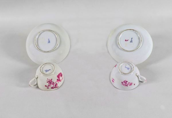 Pair of Meissen porcelain cups and saucers decorated with rose and flower motifs on a white background