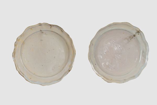 Pair of plates in glazed majolica with central decoration with palmette motif in antique yellow