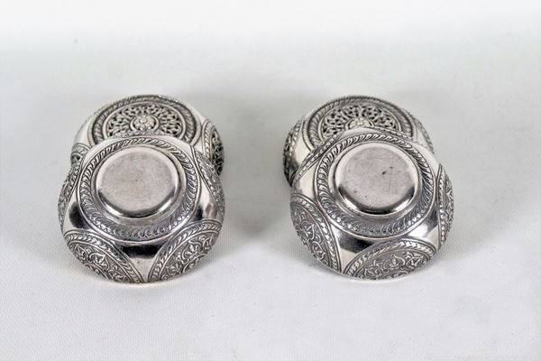 Pair of round boxes for potpourri in oriental silver entirely chiseled, embossed and perforated gr. 650