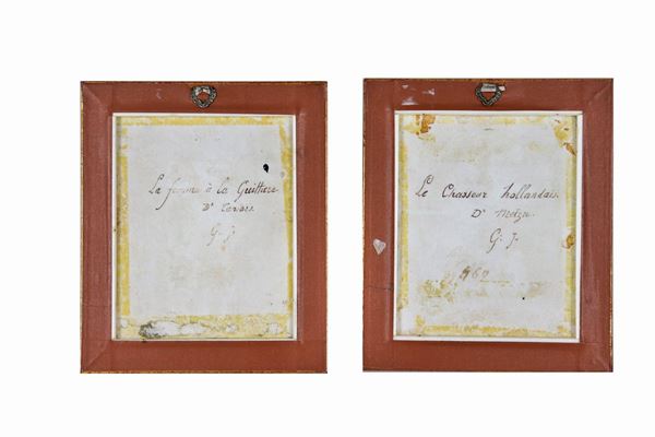 Pair of small enamelled and painted porcelain plaques "Hunter" and "Girl with guitar"