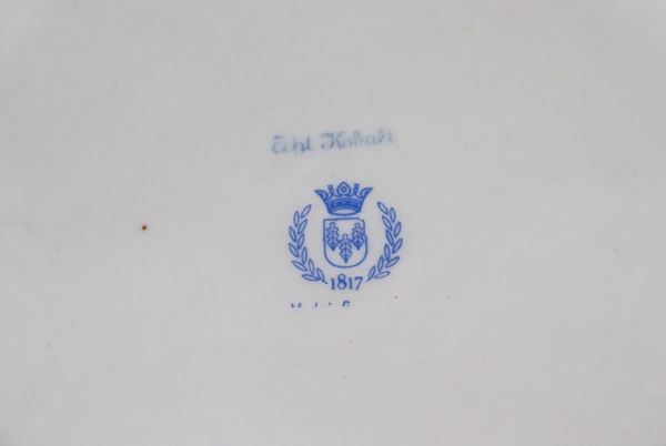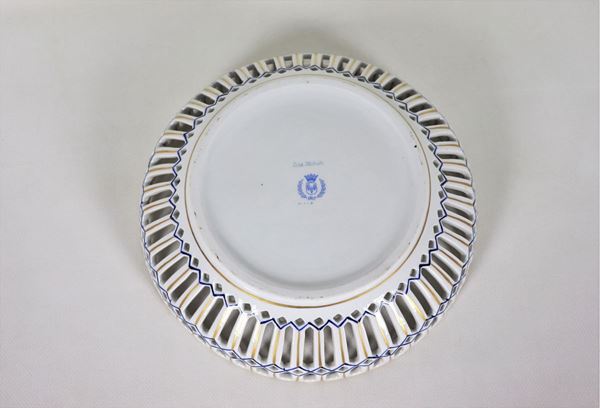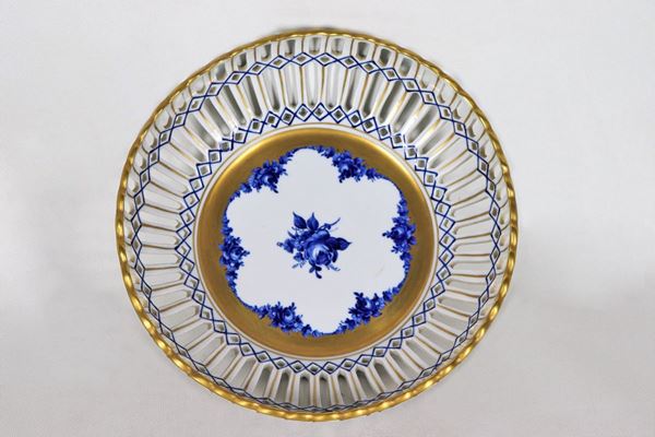 Porcelain basket decorated in blue and pure gold, on the bottom in the center bunches of roses
