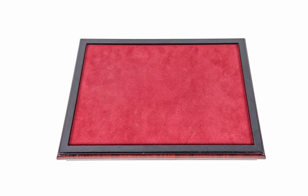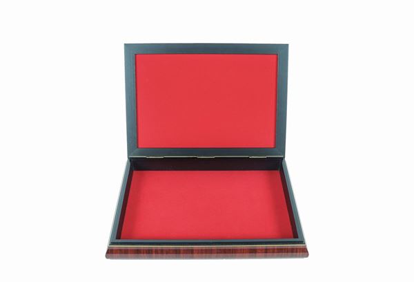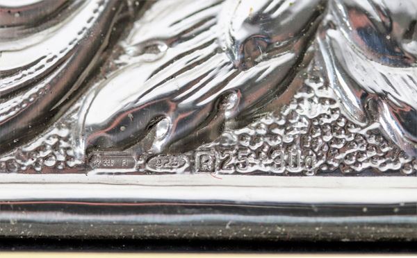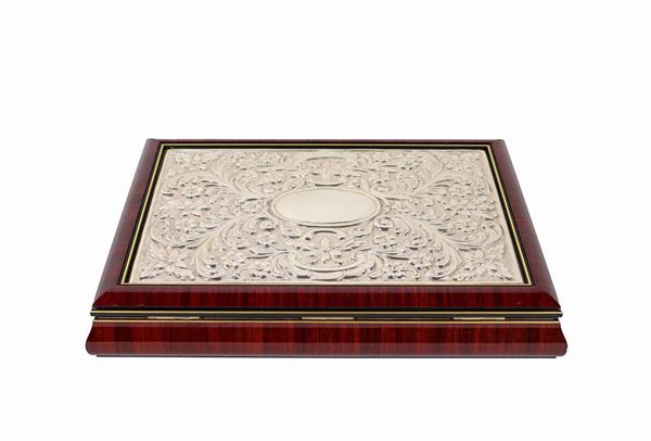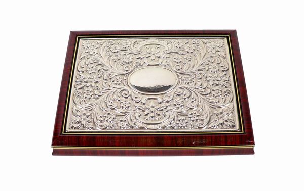 Rectangular shaped walnut card box with lid covered in chiseled and embossed silver