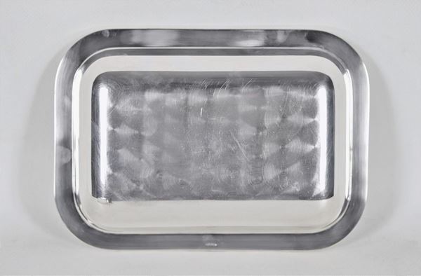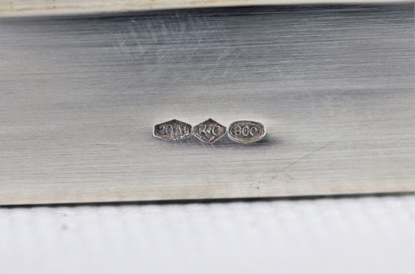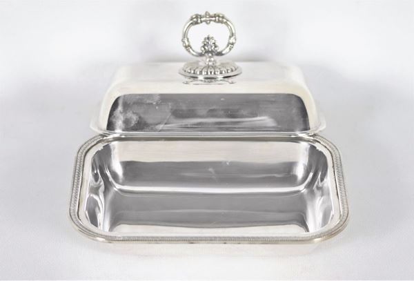 Rectangular silver vegetable dish with palmette embossed edge and chiseled pommel gr. 690