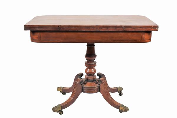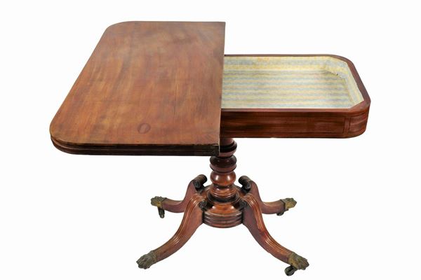rectangular in shape with hinged revolving top, supported by a turned column base resting on four saber legs. Closed 89.5 x 44 x 71 h cm, open 89.5 x 88 x 71 h cm.