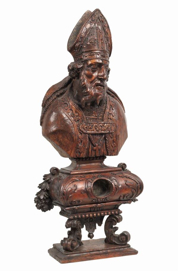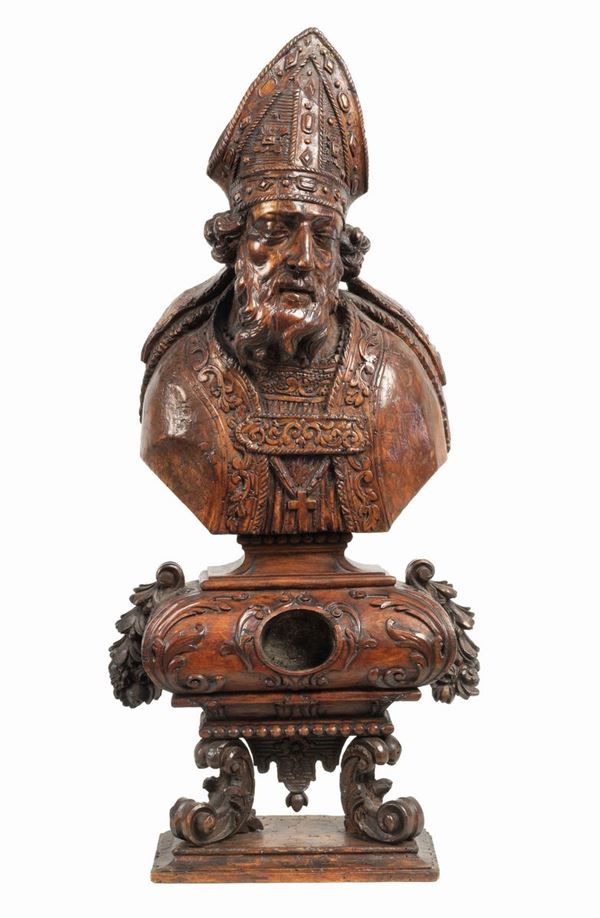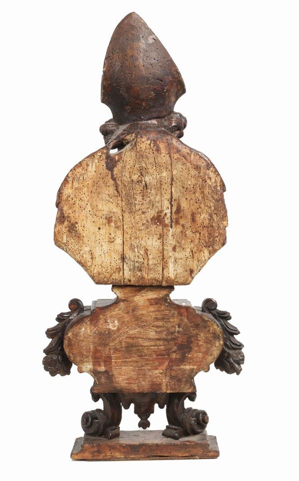 Richly carved "San Nicola" fruit wood sculpture, supported by a turned column in gilded wood