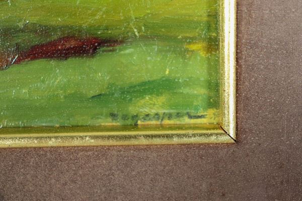 Signed. "Alpine landscape with hut" small oil painting on pressed cardboard