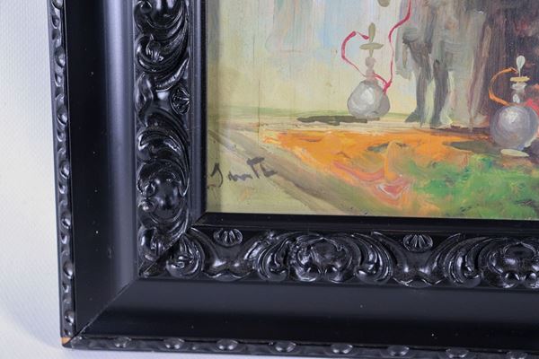 Signed. "Arabs smoking a hookah" painted in oil on plywood