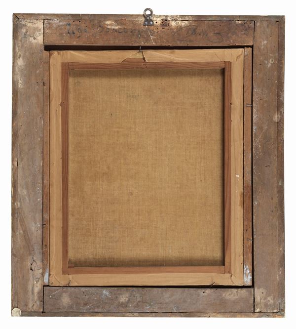 The Falciatore in his youth was a pupil of Paolo De Matteis and later of Domenico Vaccaro. He was sensitive not only to the characters of Neapolitan Baroque painting in Rococo forms, but also to the extreme chromatic refinement of the "rocaille" trend. Most of his early works portray scenes from the Old and New Testament with a neo-mannerist sensibility and with light and very bright scenographies. Antique Salvator Rosa frame in gilded wood, 60 x 51.5 cm.
