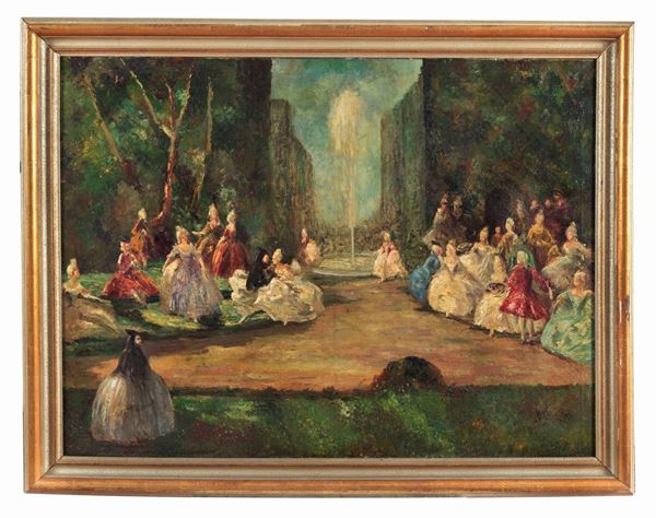 Signed. "The dance of the nobles in the park" oil painting on canvas