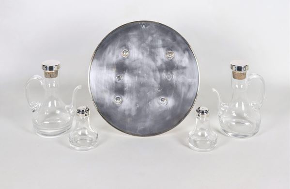 Silver metal table set with two cruets for oil and vinegar, pepper and salt shaker