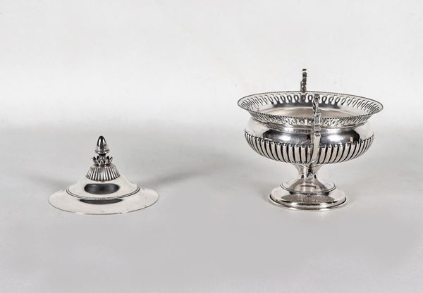 Silver sugar bowl in the shape of a chiseled and embossed amphora with two curved handles gr. 265
