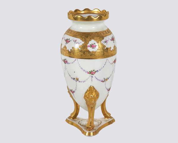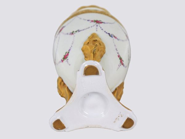 Small vase in white and gold porcelain with polychrome decorations of floral garlands