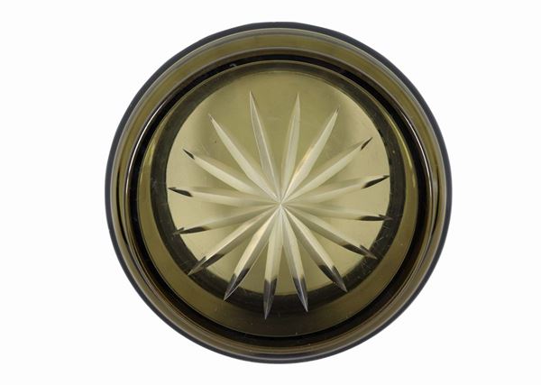 Smoked crystal salad bowl with edge covered in chiseled silver