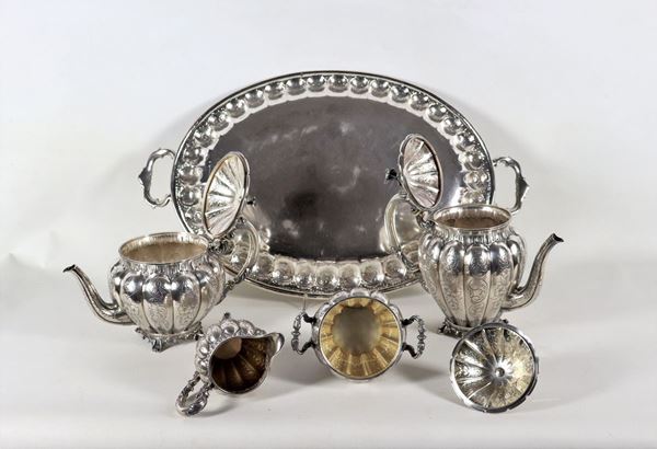 consisting of teapot, coffee pot, milk jug, sugar bowl and oval tray with handles. Tray 67 x 41 cm, maximum height 26 cm.