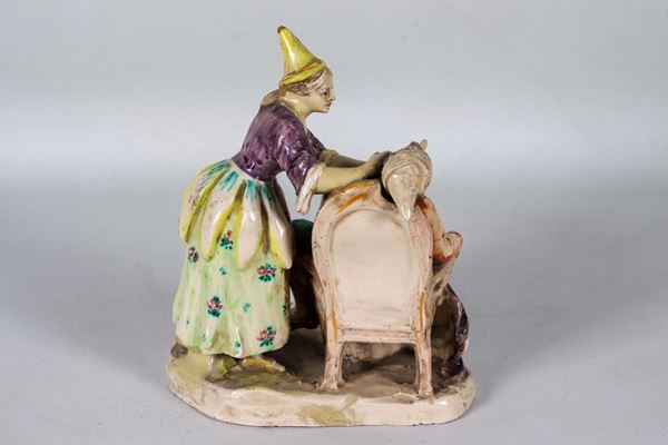 "The drunkard and the innkeeper" group in polychrome porcelain and enamelled earthenware from Bassano