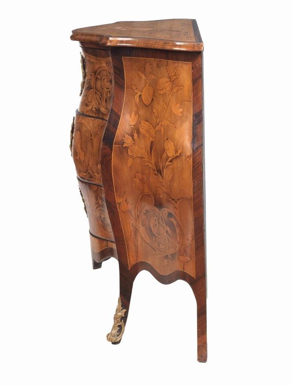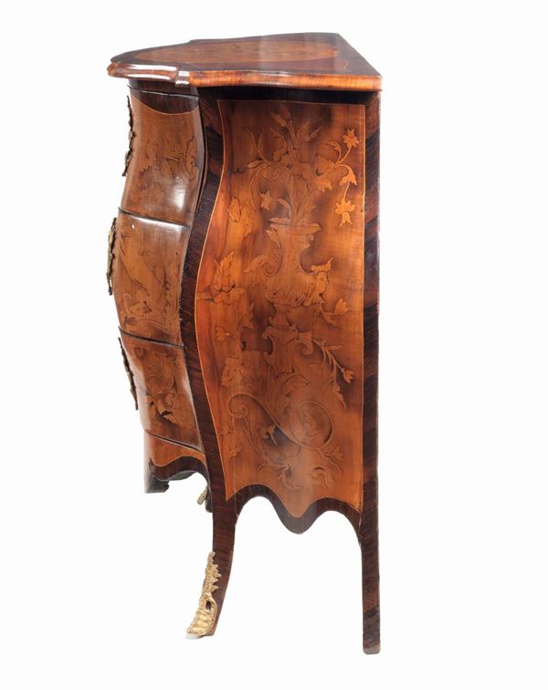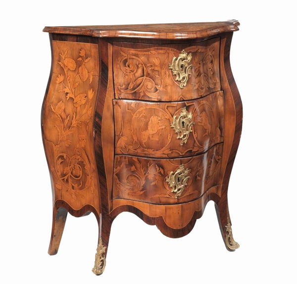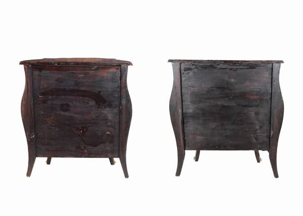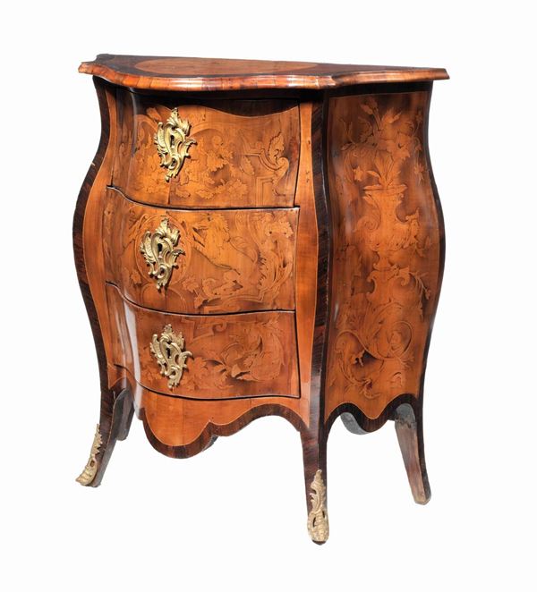 entirely inlaid with floral scroll motifs, acanthus leaves and landscapes. Three drawers each, 78 x 38 x 88 h.