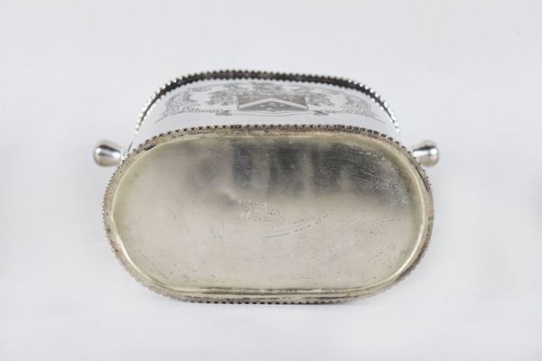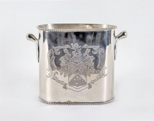 Bottle holder in silver metal with a chiseled noble coat of arms in the center