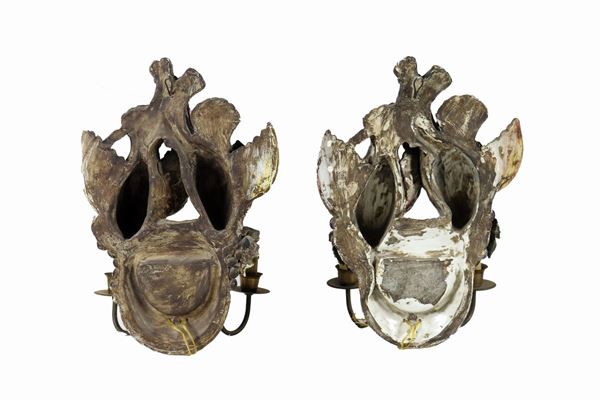 Pair of "Pernici" polychrome glazed and porcelain appliques, 2 flames each