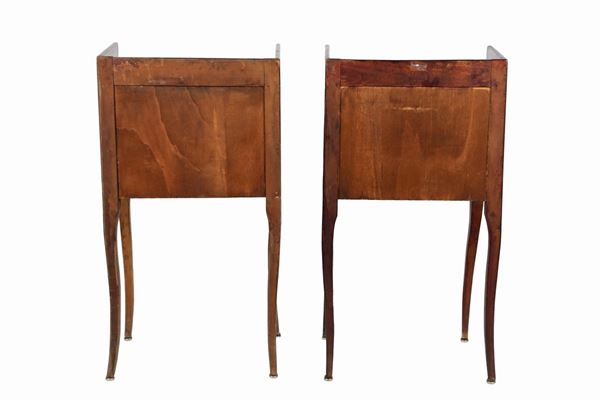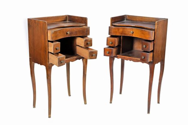 a central drawer, four underlying drawers and a compartment in the center, supported by four curved legs. To be restored, cm 38 x 25 x 63 h each.